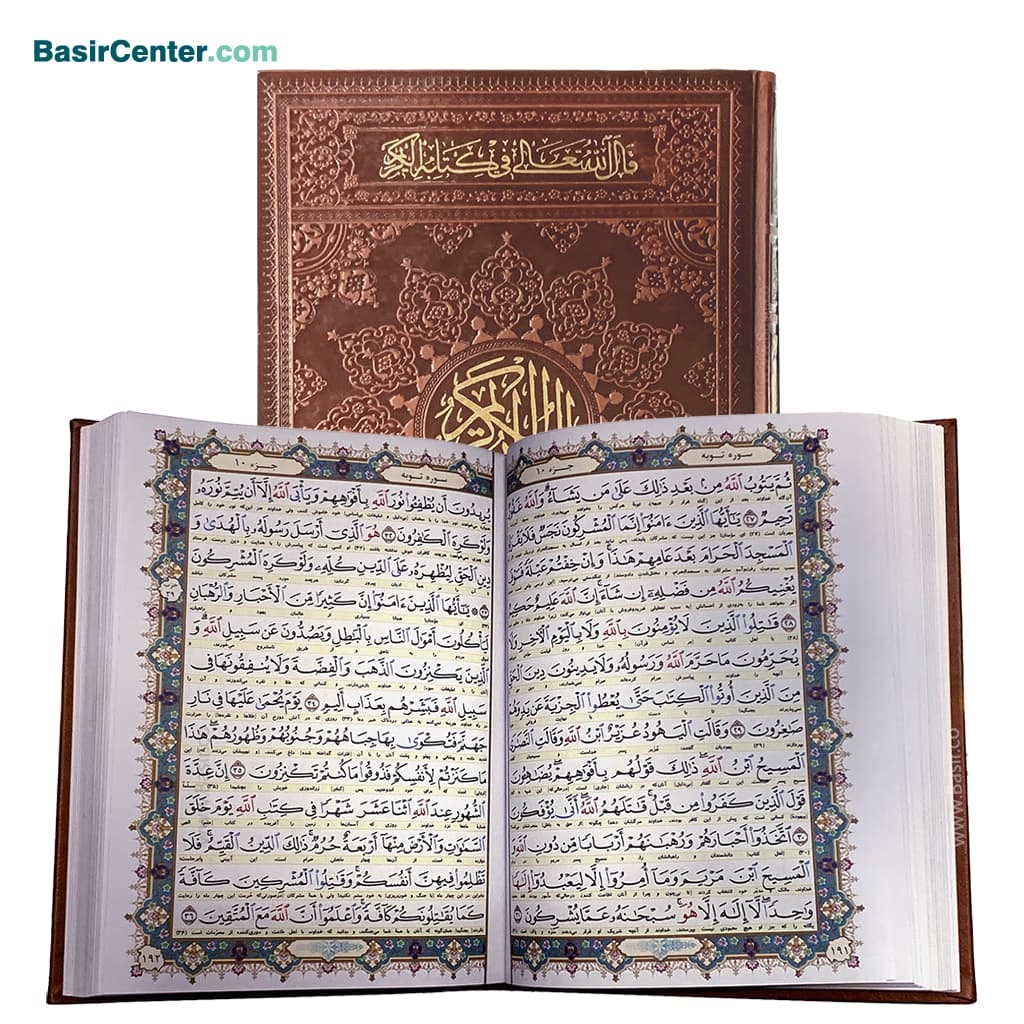 تفاوت با بسته شماره 10 کتاب قرآن در بسته های شماره 10 به صورت بسیار درشت خط 1208صفحه) همراه با تفکیک رنگ هر لغت جهت قرائت کلمه به کلمه می باشد. همچنین در بسته های شماره 9 و 10 از کیف طرح چرم استفاده شده است.