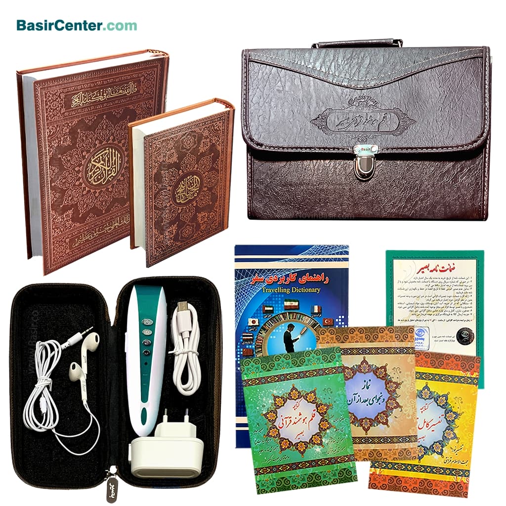 این بسته کامل ترین و پرفروشترین بسته قلم قرآنی بصیر که به صورت ویژه توسط موسسه فرهنگی و قرآنی بصیر عرضه می گردد .این بسته همراه با قرآن وزیری کاملا رنگی (604 صفحه) دارای ترجمه فارسی زیر، کتاب منتخب مفاتیح درشت خط، سه عدد دفترچه امکانات و راهنما و با کاملترین امکانات همراه با کیف طرح چرم، با قلم هوشمند با کیفیت بسیار عالی و قابلیت به روز رسانی و استفاده از جدیدترین کتاب های تولید شده توسط موسسه بصیر گامی جدیددر نسل قلم های هوشمند نهاد. این بسته از هر لحاظ مورد تائید شرکت بصیر است و نسبت به بسته های مشابه امکانات عالی و بی نظیر است که توسط این موسسه با قیمتی مناسب و پشتیبانی عالی توزیع می گردد.
