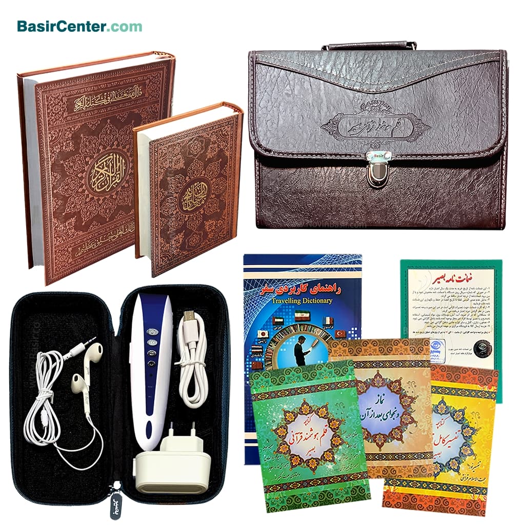 این بسته کامل ترین بسته قلم قرآنی بصیر می باشد که به صورت ویژه توسط شرکت بصیر عرضه می گردد .این بسته همراه با قرآن وزیری کاملا رنگی (604 صفحه) دارای ترجمه فارسی زیر، کتاب منتخب مفاتیح درشت خط و کاملترین امکانات همراه با کیف طرح چرم با قلم هوشمند با کیفیت بسیار عالی و قابلیت به روز رسانی و استفاده از جدیدترین کتاب های تولید شده توسط موسسه بصیر گامی جدید در نسل قلم های هوشمند نهاد. این بسته از هر لحاظ مورد تائید شرکت بصیر است و نسبت به بسته های مشابه دارای کیفیت و امکانات عالی و بی نظیر است که توسط این موسسه با قیمتی مناسب و پشتیبانی عالی توزیع می گردد.