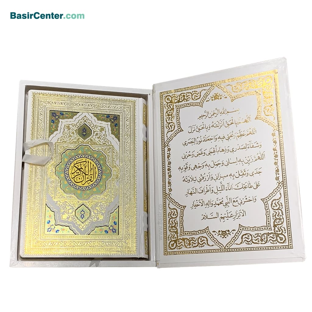 کتاب قرآن نفیس و معطر بسیار زیبا (قرآن عروس) در قطع وزیری طرح جلد و قاب سفید گالینگور همراه با پلاک طلایی رنگی و کاغذ معطر مارگانو آلمان (طرح ابر و باد) و چاپ رنگی و تذهیب بسیار عالی با ترجمه فارسی می باشد.