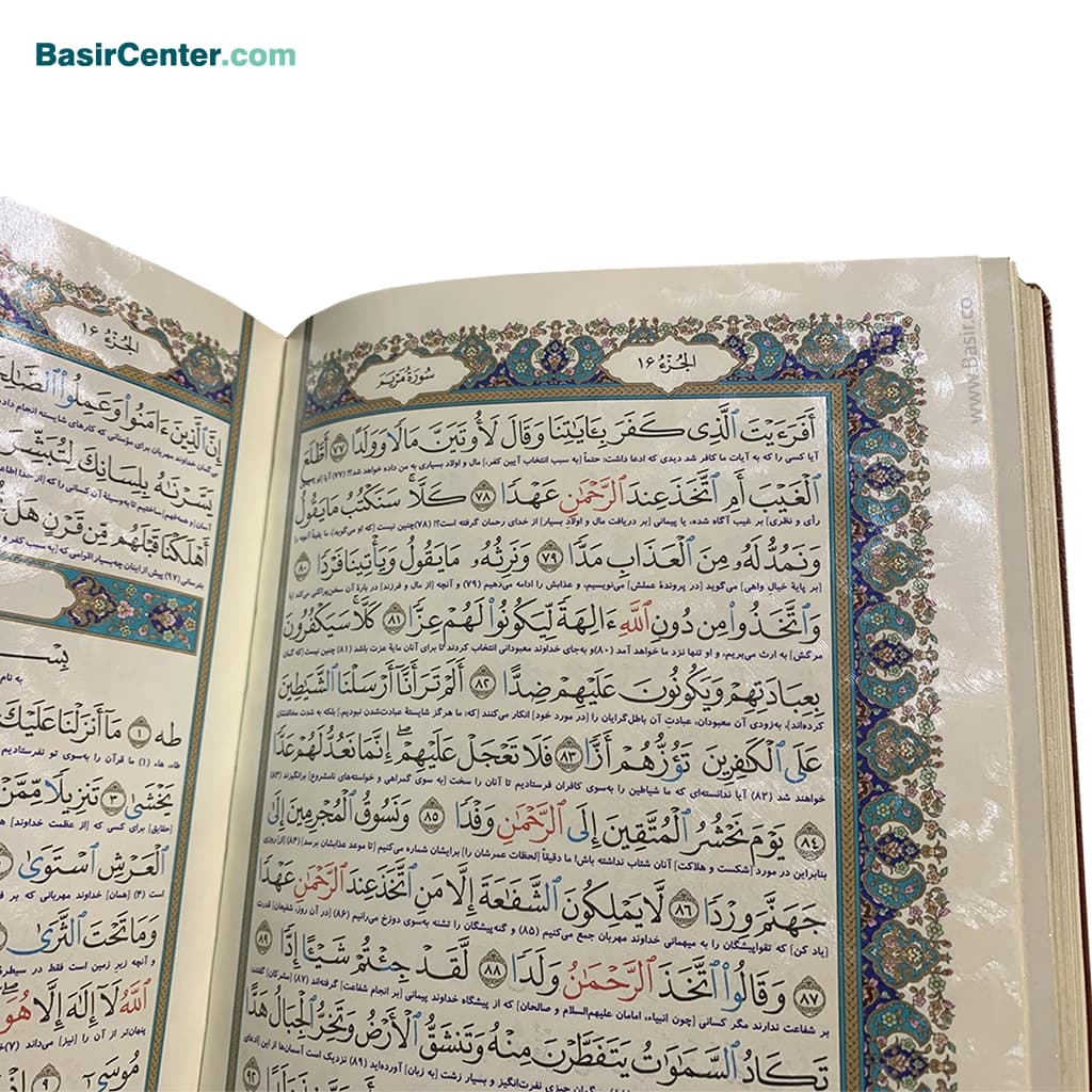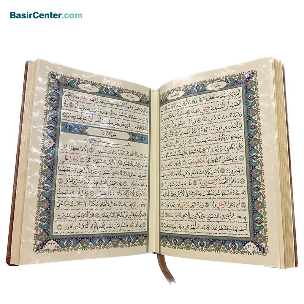 کتاب قرآن نفیس و معطر بسیار زیبا در قطع وزیری با کاغذ معطر مارگانو آلمان (طرح ابر و باد) لبه طلا و چاپ رنگی و تذهیب بسیار عالی با ترجمه فارسی همراه با جلد و قاب چرمی لیزری دارای پلاک طلایی رنگی زیبا با کیفیت بی نظیر که بسیار مورد استقبال تمامی مسلمانان در داخل و خارج از کشور قرار گرفته و توسط این موسسه (انتشارات نوین بصیر) به چاپ رسیده است، این کتاب نفیس زیبا و ارزشمند به صورت تک و یا در تعداد بالا در سراسر ایران و سایر کشورها به صورت مستقیم و با تخفیف های پله ای عالی توزیع می گردد.
